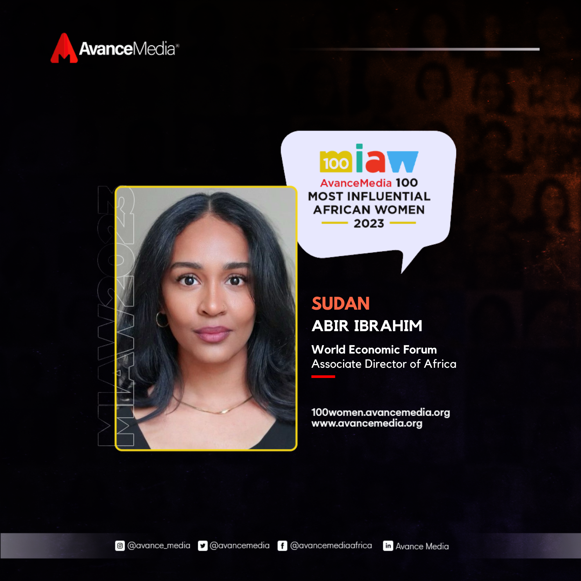 Abir Ibrahim stands as a beacon of inspiration and influence, having been named in the 5th list of 100 Most Influential African Women in 2023 by Avance Media. With a distinguished career as a Sudanese-American development practitioner, [Name] currently serves as the Associate Director of Africa at the World Economic Forum in Geneva, Switzerland.