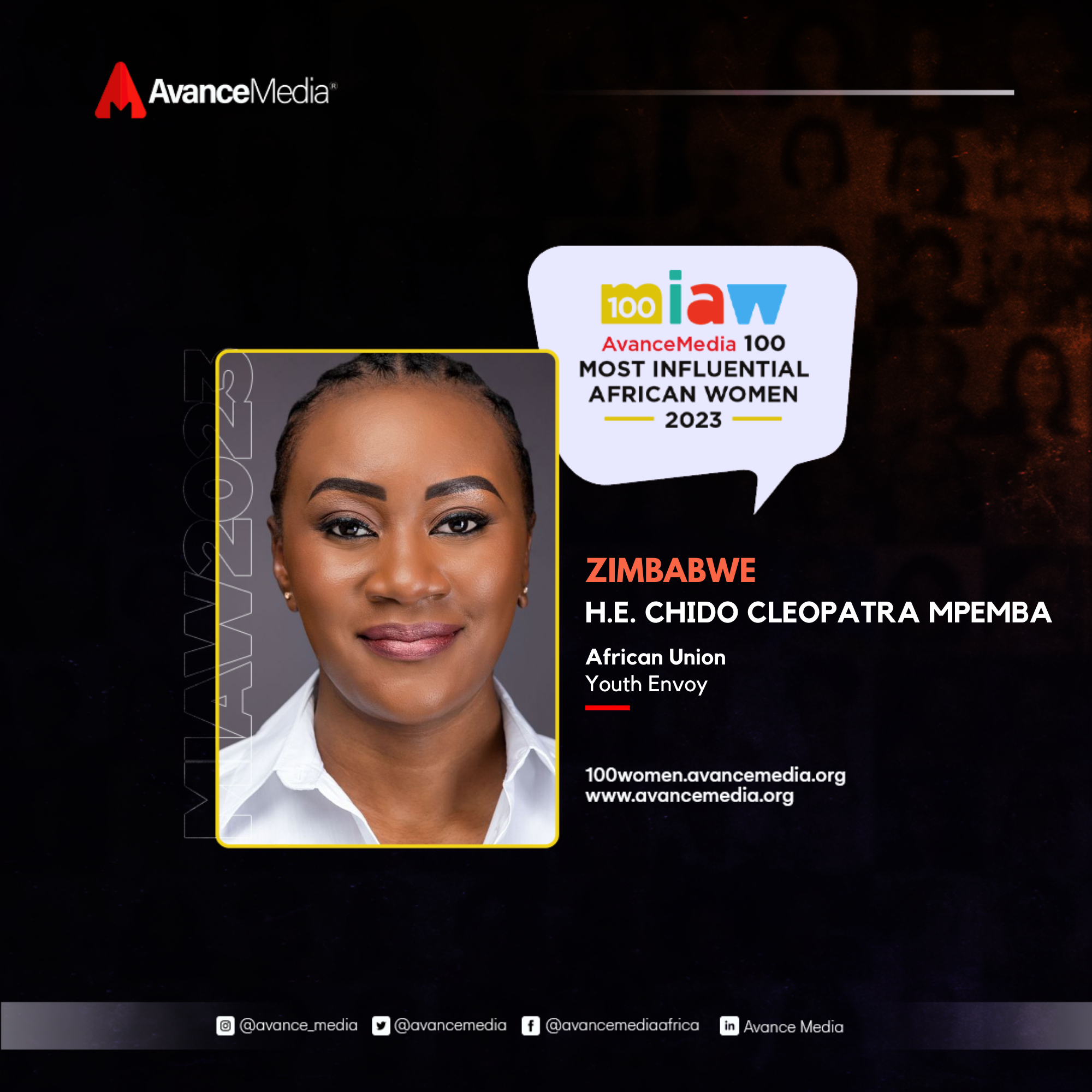 Chido Cleopatra Mpemba’s recognition in Avance Media’s 2023 100 Most Influential African Women list attests to her exceptional leadership and impact on the African continent. As the Special Envoy for Youth at the African Union Commission, she continues to play a pivotal role in advocating for the development and empowerment of Africa’s youth. Chido’s journey from her early life in Zimbabwe to becoming a key figure at the African Union exemplifies her dedication to driving positive change and shaping the future of the continent.